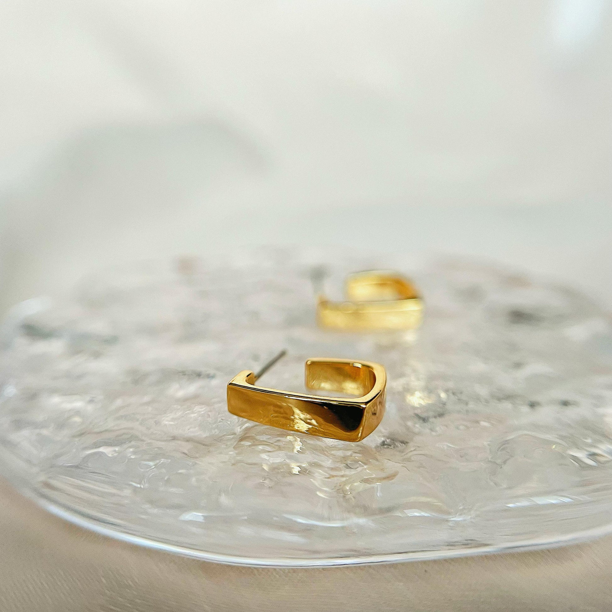 A unique and modern twist on the classic hoop design with its shiny gold finish which enhances the sleek and contemporary look, these hoops are perfect for someone looking to add a bit of edge and sophistication to their earrings collection.